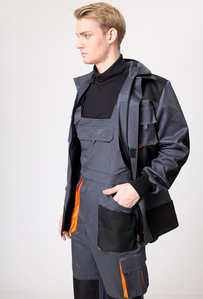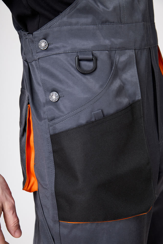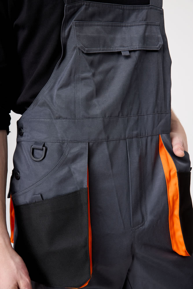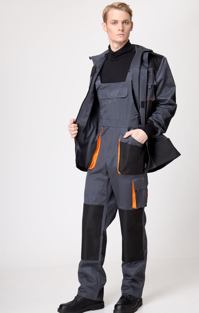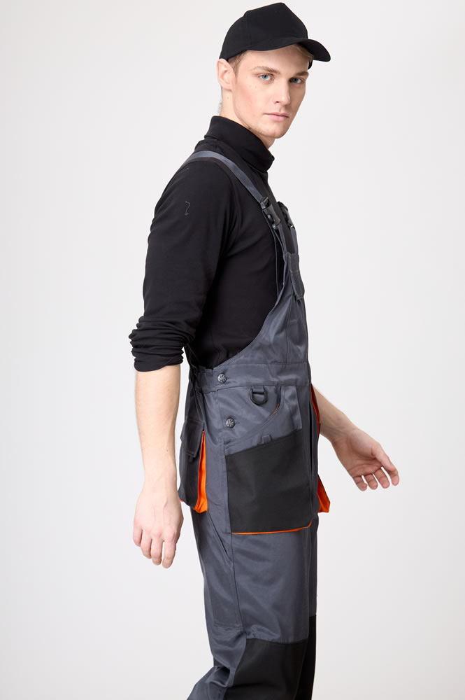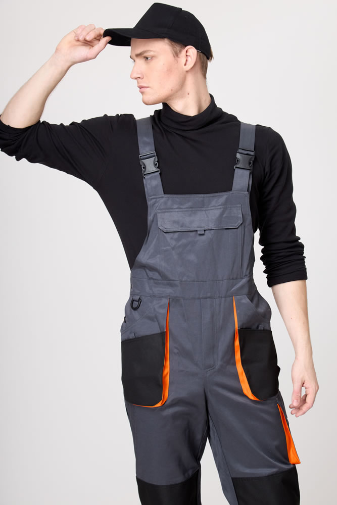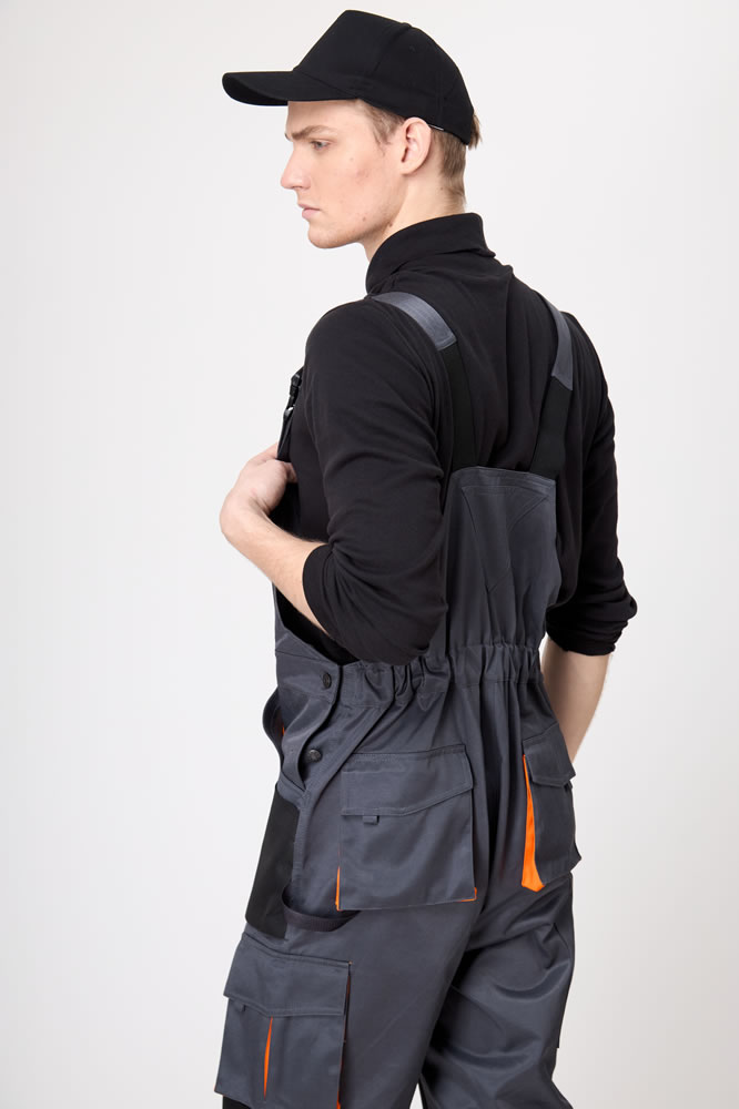 Полукомбинезон мужской с отрезной верхней частью от брюк. Фиксируется не на плечевом поясе, а с помощью бретелей и крепления застежки/фастекс.