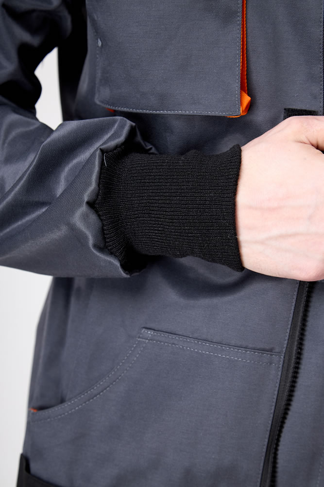 Воротник – стойка. Рукав втачной, курточный. На эластичной высокой манжете. По локтевой части рукава сзади, расположены элементы фигурных налокотников из отделочной ткани.