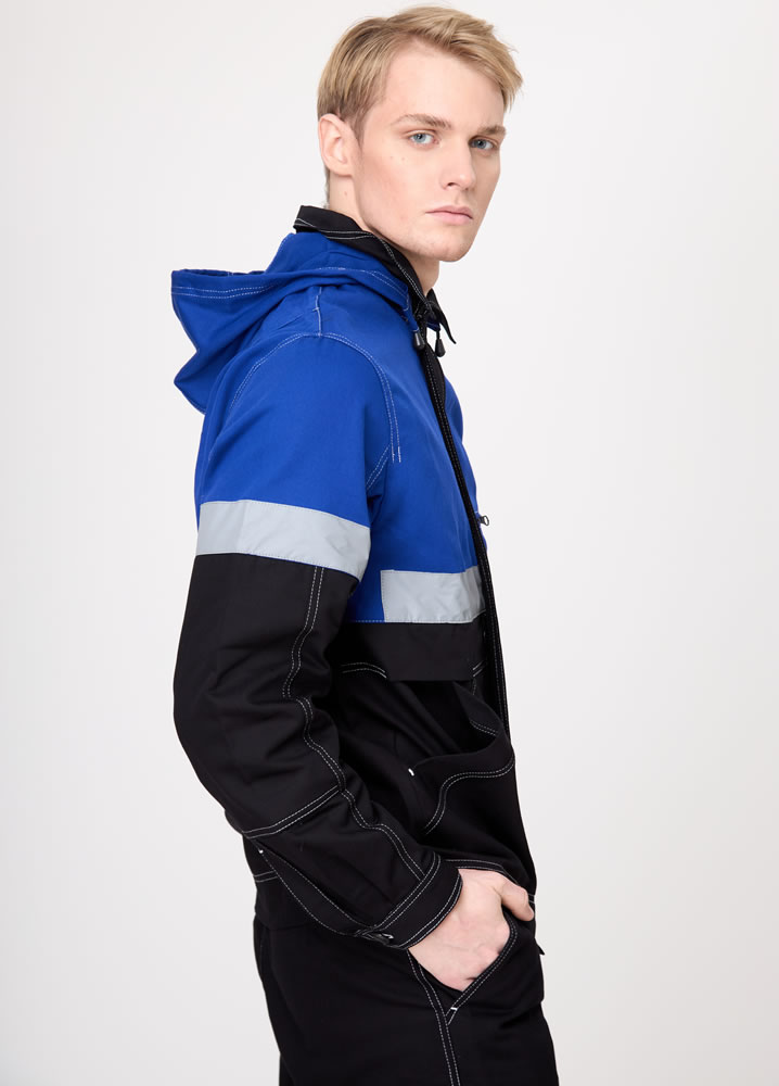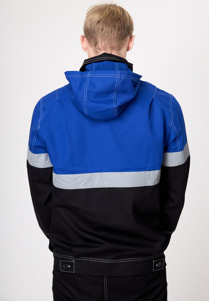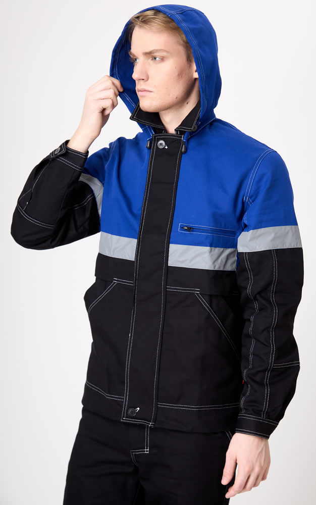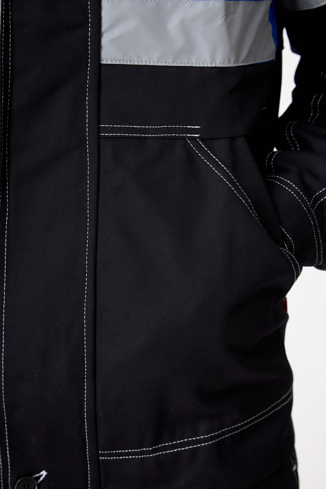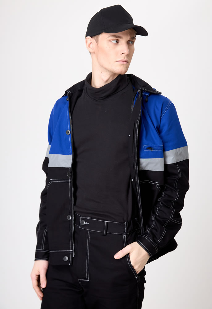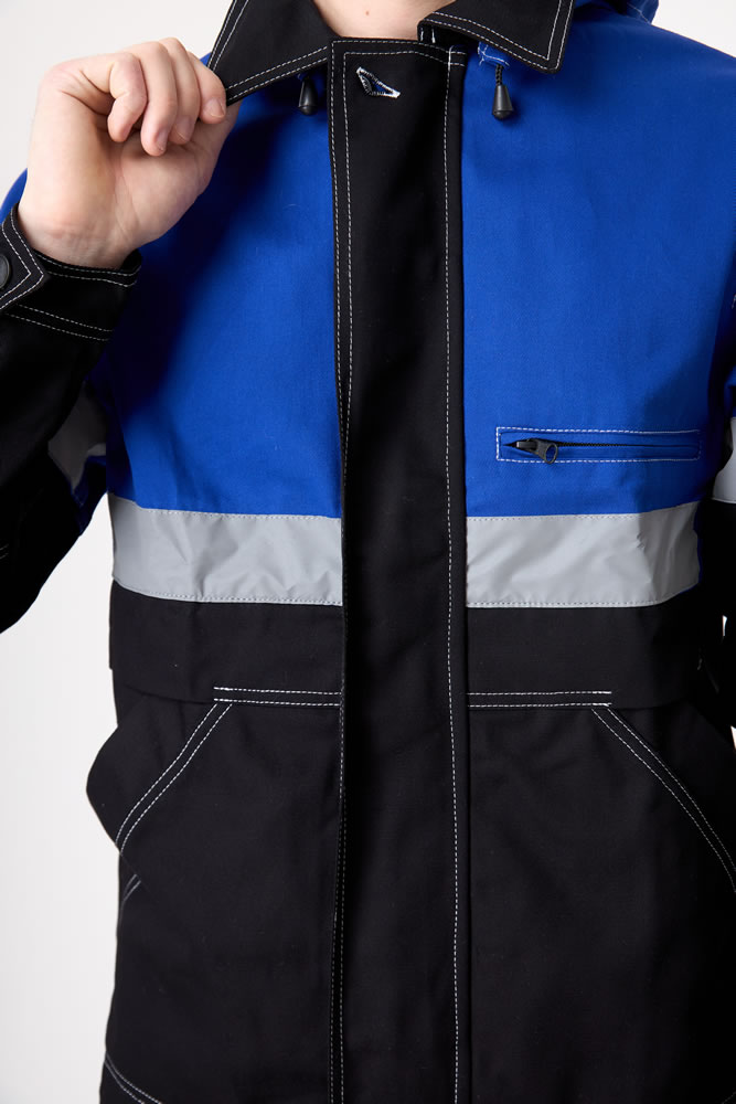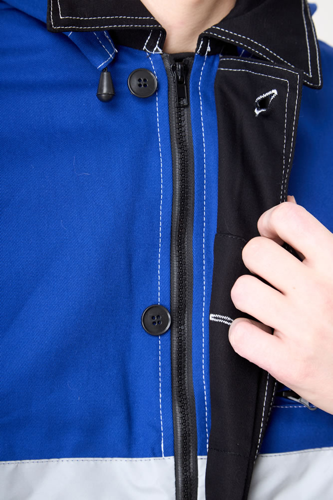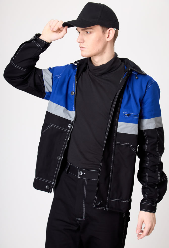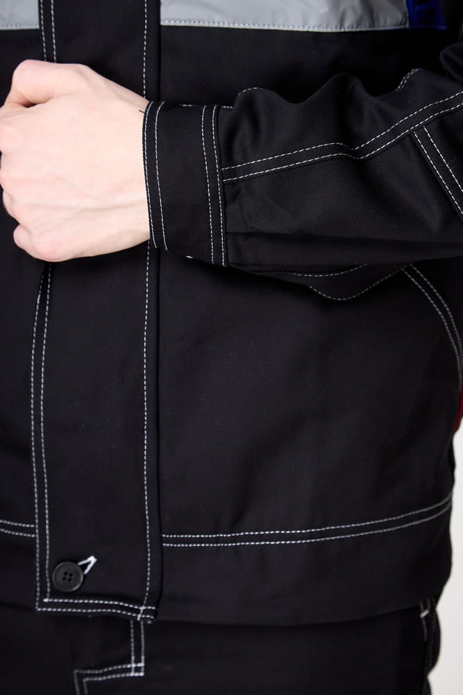 Рукав втачной, курточный, с отрезными линиями пропорционально самой куртке, оснащены СВО лентой шириной 5,0 см. По низу, рукав на фиксирующей манжете. Куртка имеет яркий дизайн не только за счет сочетания контрастных решений. Но и за счет яркой двойной строчки по всем рельефам и швам (боковые, рельефы, кокетки, карманы, линия проймы и т.д.)