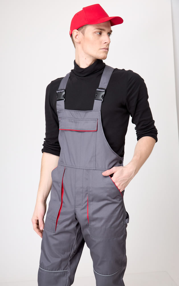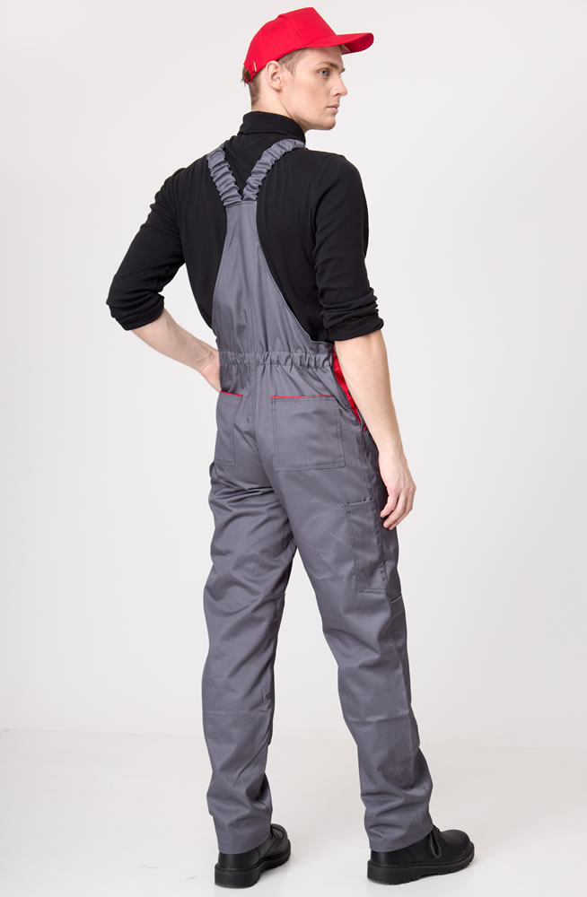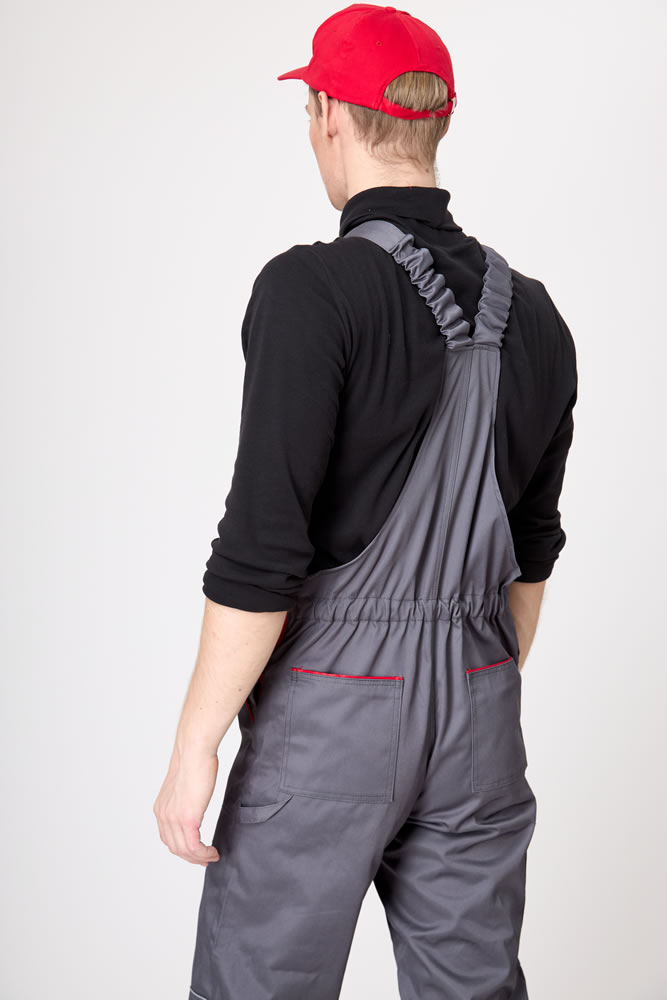 На передних частях полукомбинезона полуобъемные по передней линии накладные боковые карманы с косым входом. Нижняя часть карманов усилена дополнительным слоем ткани. В среднем шве передних частей застежка на три петли и три пуговицы.